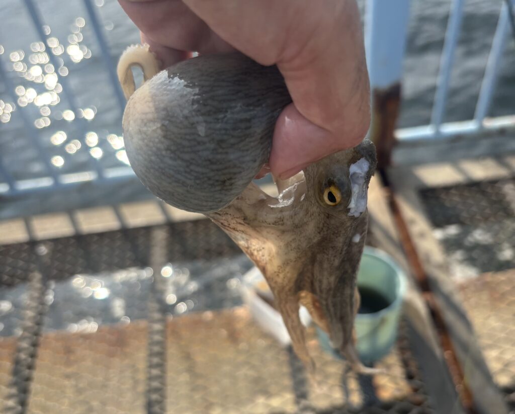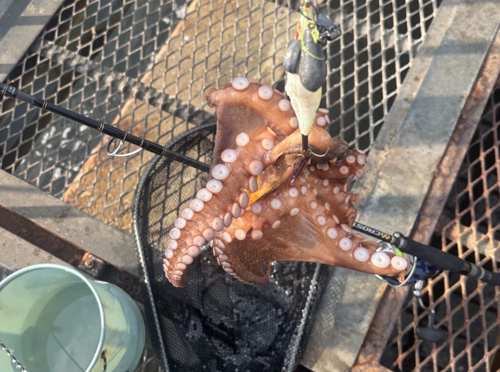 仕掛けを投入してすぐ、エギの根掛かりかと思った瞬間に重みが!ゆっくり合わせると、なんと1kgクラスのタコが乗った。足の一部が欠けているが、引きは力強い。続けてもう一杯、連続ヒットでタコの好調ぶりを実感する。