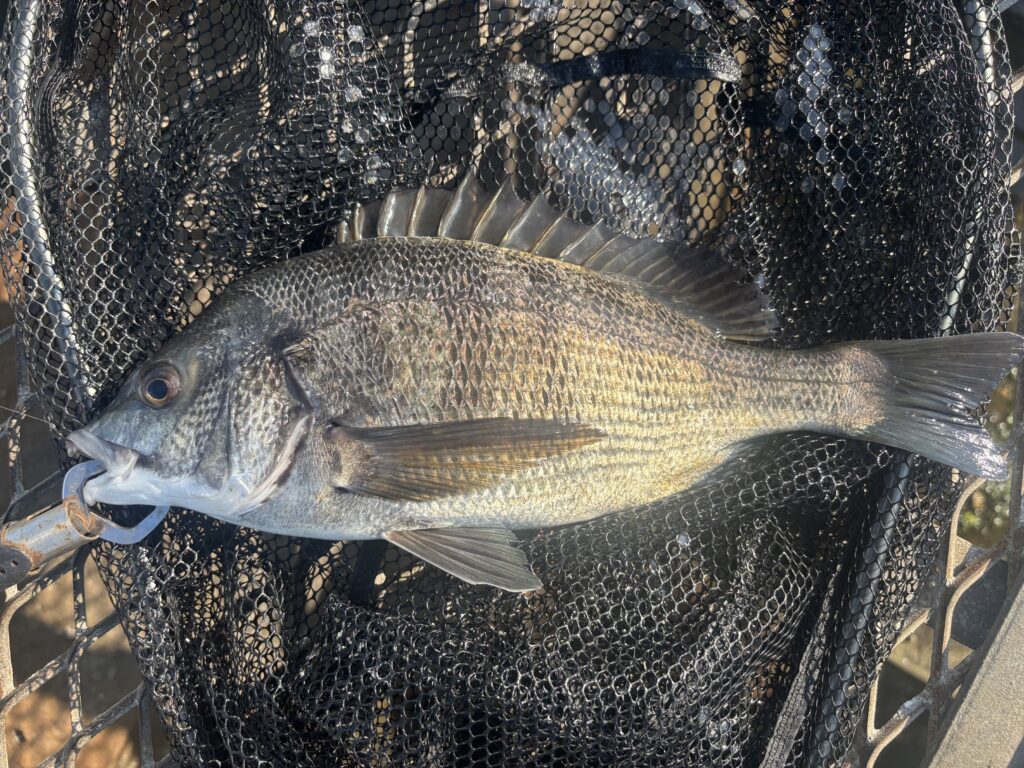 浮かんできたのは35㎝ほどの綺麗な回遊型黒鯛。夕まずめ前に一枚目を確保し、一安心。