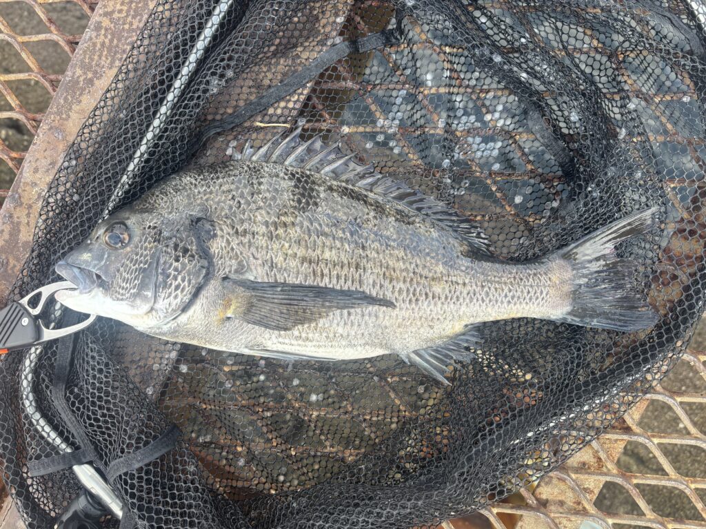 祭ったまま浮かせたのは40㎝ほどの黒鯛。居着きか回遊かは判別が難しいが、パワフルで元気な一枚。朝イチからのヒットに「今日はもっと伸びるかもしれない」と気合が入る。
