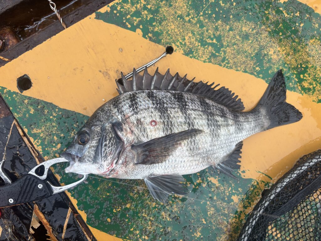 黒鯛カップのサイズには届かず残念だが、午前中だけで5枚の黒鯛を釣り上げ、雨と寒さを忘れるほどの充実感。