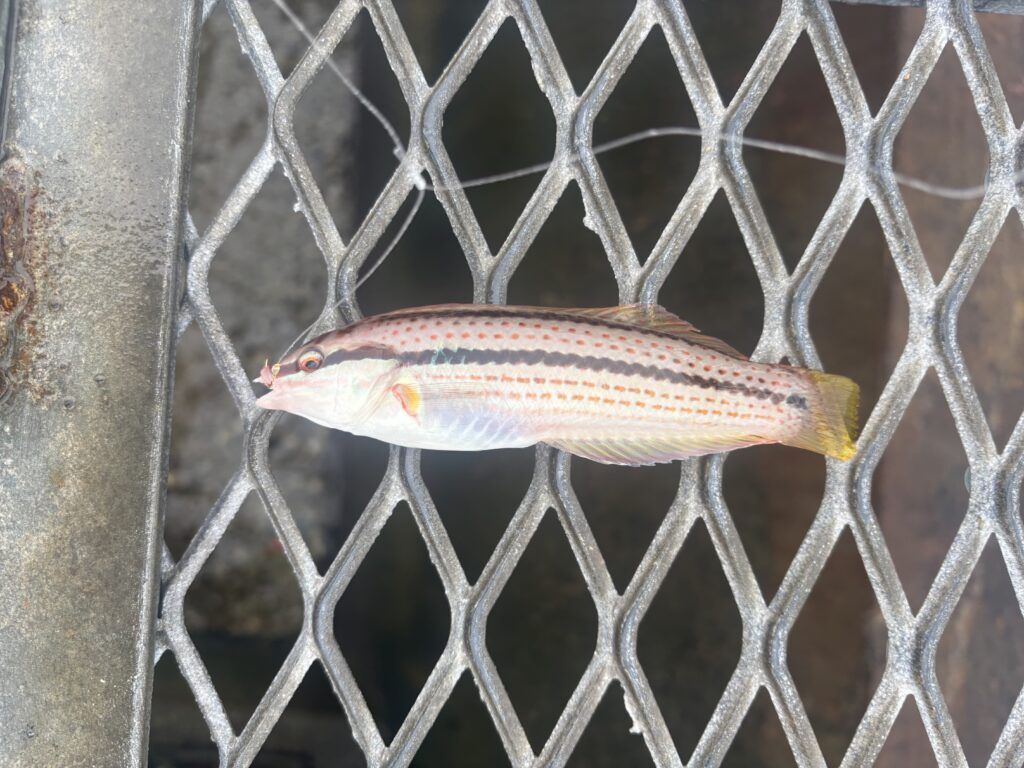 隣の釣り人がカワハギを釣り上げたので、軽く狙ってみたが釣れたのはベラとミニカサゴのみ。