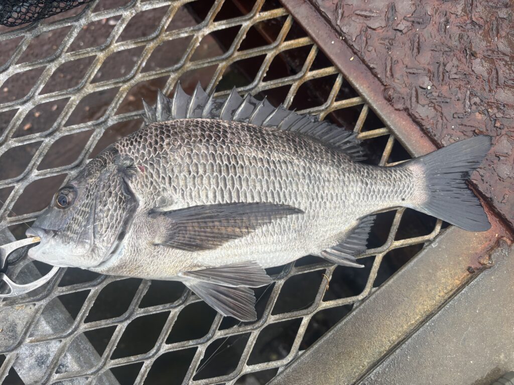 足元のケーソンに突っ込もうとするのを必死に耐え、ついに浮かせたのは40cmほどの黒鯛。