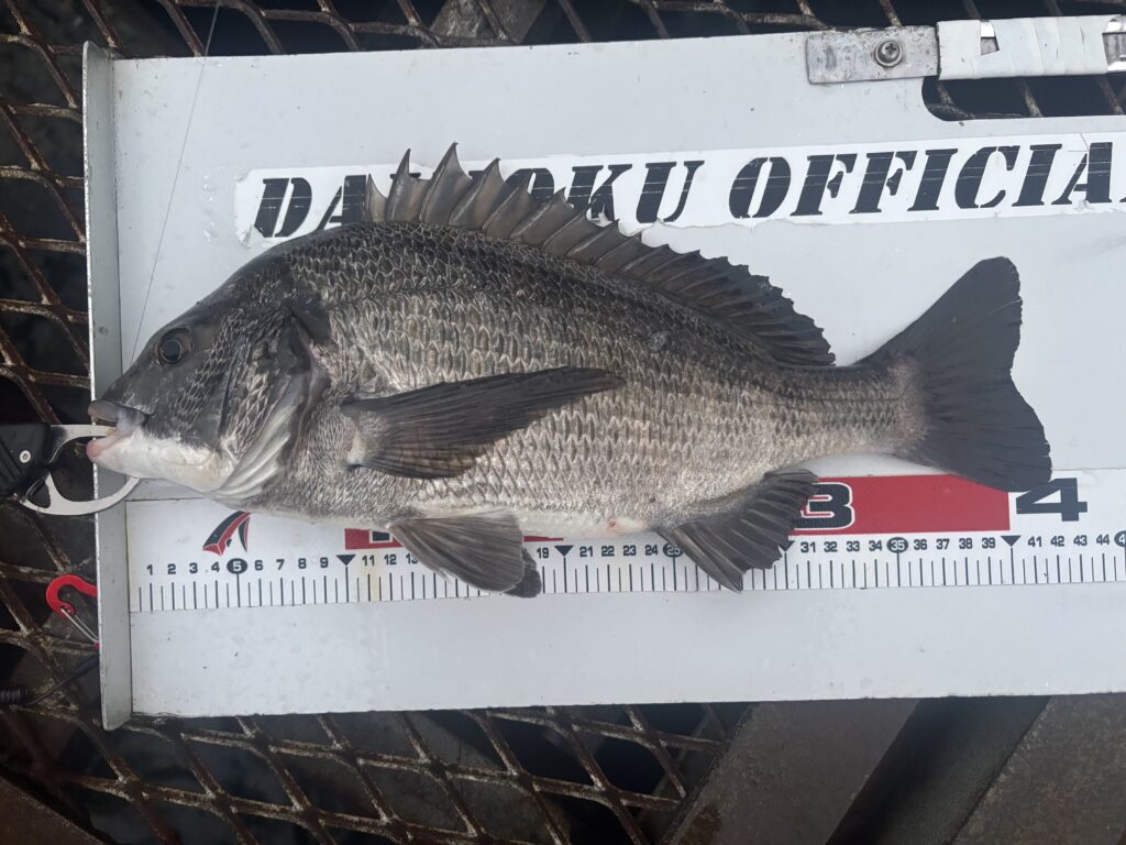 上がってきたのは42cmの良型黒鯛。